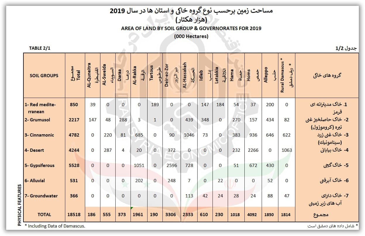 • ۳۴۸ +۹۰۳هزار هکتار (حدود ۷ درصد از خاک سوریه) به ترتیب به صورت زمین بایر (غیر قابل کشت) و کشت نشده (عدم آماده سازی برای کشت) وجود داشته است.